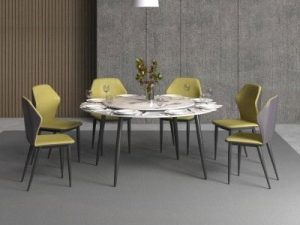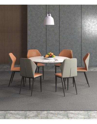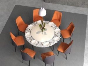 Bàn ăn mặt tròn xoay được chế tác từ đá Ceramic màu trắng vân dày 12mm, phần dưới đường kính 1500 mm, phần trên đường kính 900 mm. Hệ thống chân ống Ø50 tóp côn kết hợp khung đỡ bằng thép hộp 25×50, phủ sơn đen sần hoặc kem, mang lại sự chắc chắn và thẩm mỹ.