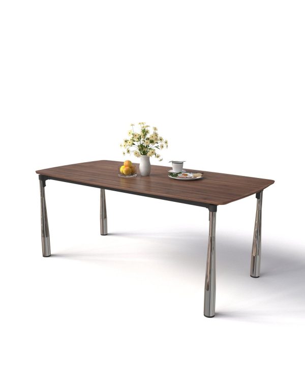 Bàn sử dụng chân sắt kiểu gậy bóng chày mạ giả inox màu nòng súng, liên kết bằng khớp nhôm hợp kim với khung mặt bàn. Mặt bàn làm từ gỗ Plywood dày 18mm phủ melamin 2 mặt, cạnh bàn được vát chéo tinh tế, vừa bền chắc vừa mang tính thẩm mỹ cao.